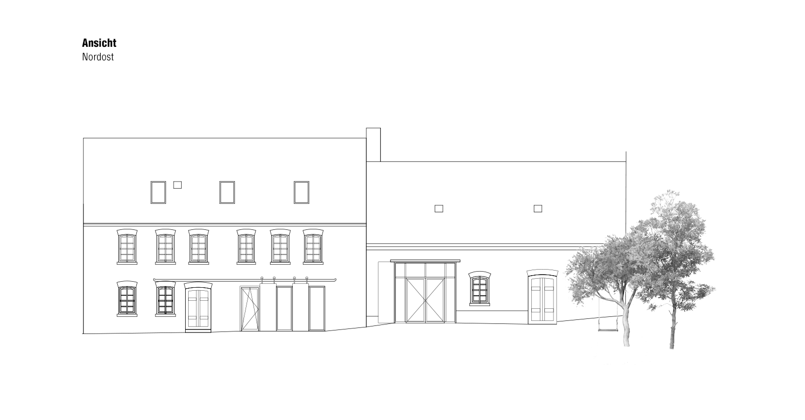 Der Entwurf setzt auf einen bewussten Umgang mit der vorhandenen Substanz. Unregelmäßiges Mauerwerk bleibt sichtbar, großflächige weiße Bereiche schaffen Ruhe und dienen als neutraler Hintergrund für wechselnde Formate. Eine neu eingefügte Fensterfront an Stelle des ehemaligen Tores öffnet den Raum, stärkt Blickbeziehungen und verbessert die Belichtung.
