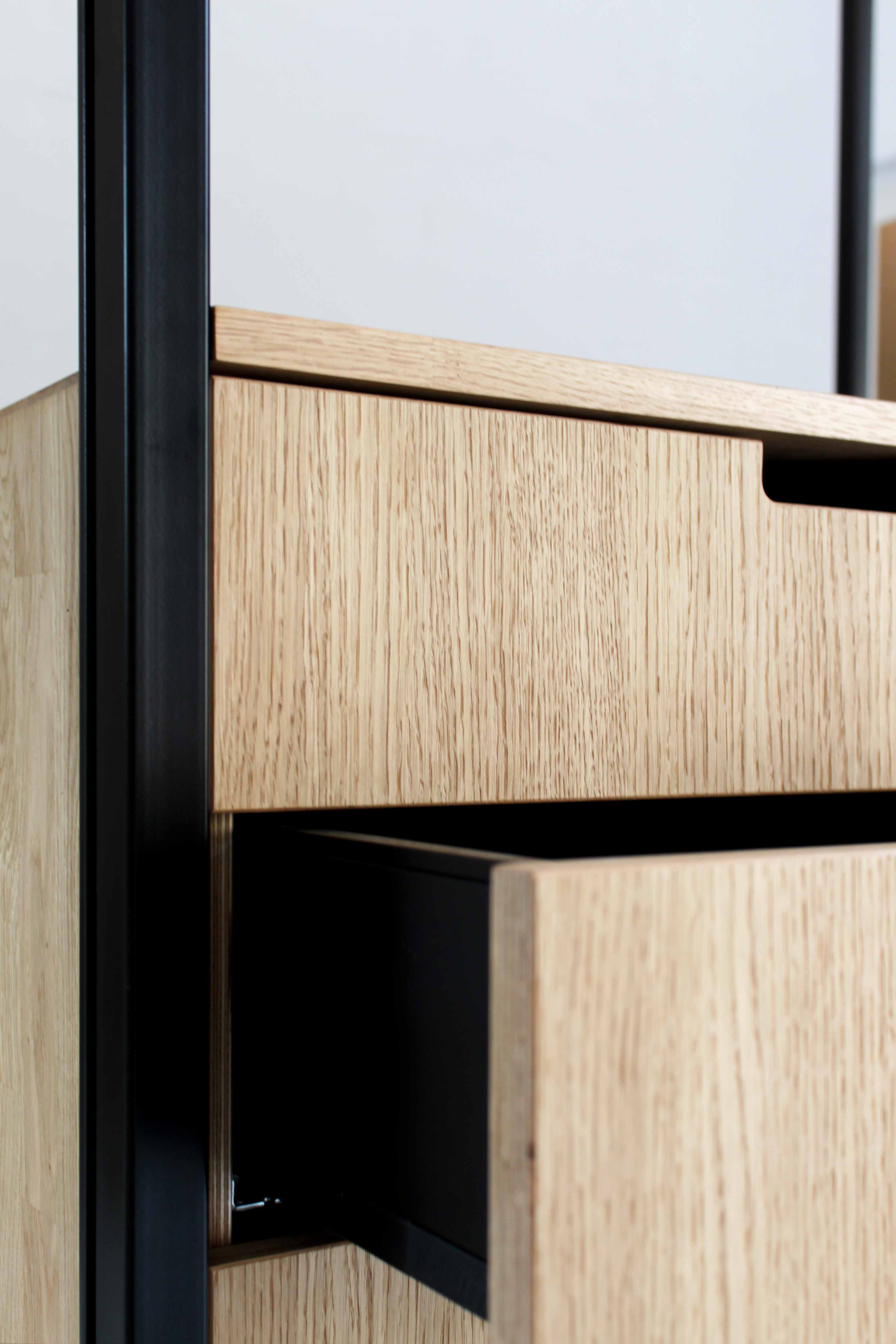 Zentrales Element sind mobile Wagen aus schwarz pulverbeschichtetem Stahl mit Multiplex- und Eichenoberflächen. Sie strukturieren Veranstaltungen flexibel und werden bei Nichtgebrauch ausgelagert. Gelbe Stühle, weiße Tische und farbige Leuchtenkabel setzen gezielte Akzente innerhalb der ansonsten zurückhaltenden Materialität. Auch das Lichtkonzept ist variabel angelegt und ermöglicht durch Schalten und Dimmen unterschiedliche atmosphärische Situationen.